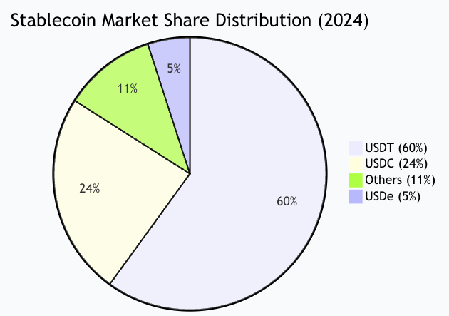 - USDT, leveraging first-mover advantage and extensive exchange support, occupies approximately 60% of the market share, becoming the market benchmark.