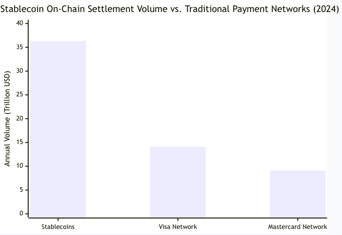 The annual on-chain settlement volume of stablecoins reached $36.3 trillion. This figure not only surpassed the combined annual transaction volume of Visa ($14.1T) and Mastercard ($9.1T) for the first time but, more importantly, reveals the huge potential of stablecoins as a global value transfer layer. It proves that stablecoins have already become a massive throughput settlement network on the blockchain.